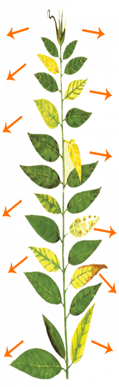 Growing plants act as integrator of all growth factors and are the products in which the grower is interested. Therefore, careful inspection of the growing plant can help identify a specific nutrient stress. if a plant is lacking in a particular nutrient, characteristic symptoms may appear. Deficiency of a nutrient does not directly produce symptoms. Rather, the normal plant processes are thrown out of balance, with an accumulation of certain intermediate organic compounds and a shortage of others. This leads to the abnormal conditions recognized as symptoms. Visual evaluation of nutrient stress should be used only as a supplement to other diagnostic techniques (i.e., soil and plant analysis). Nutrient deficiency symptoms may be classified as follows: